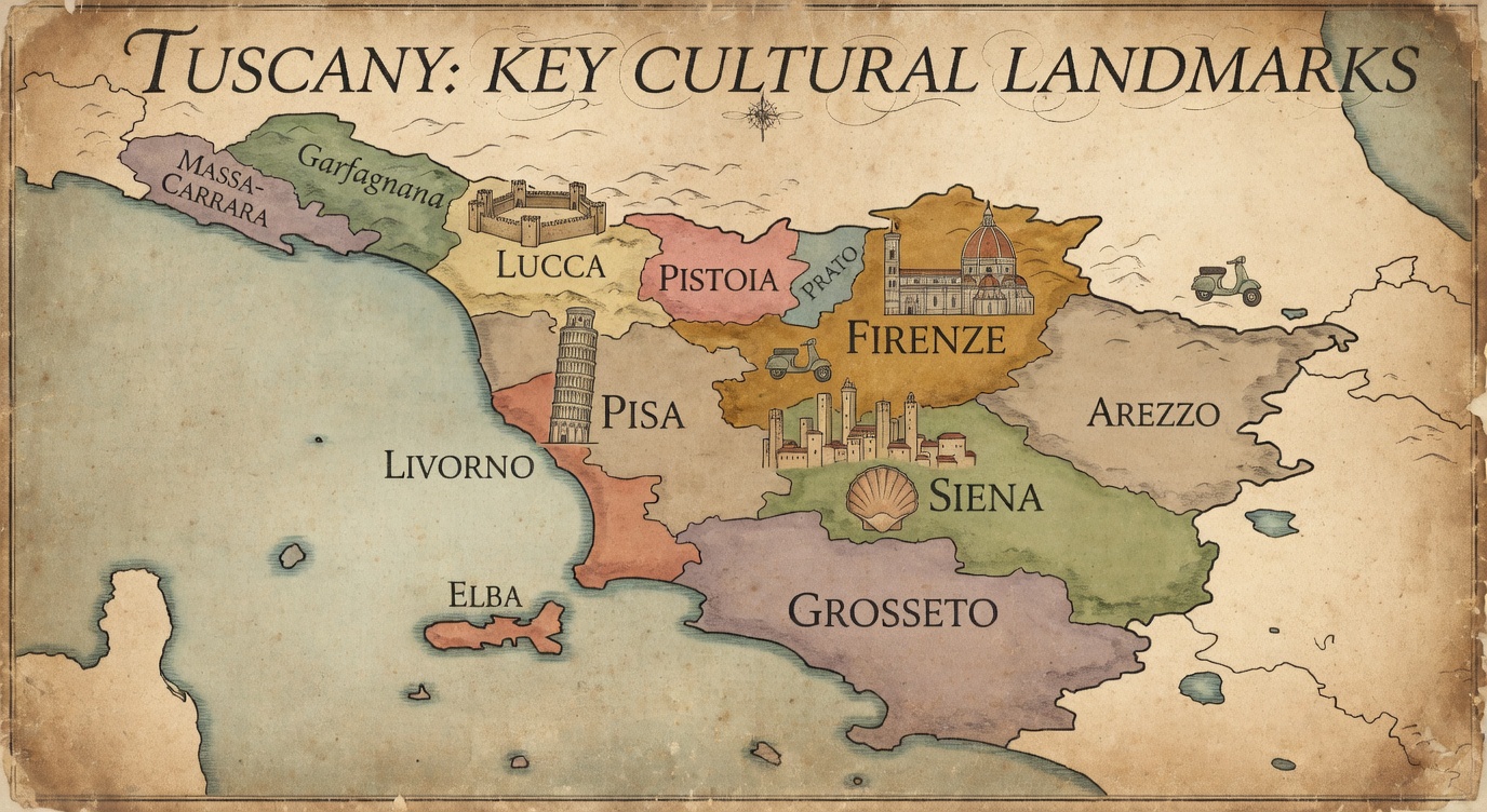 | Lucca & Northwest | Flat plain, walled city, Apuan Alps, Garfagnana forest | Lucca city, Garfagnana mountains, Cinque Terre day trip | Lucca | 30 min from Pisa airport; cooler in summer |